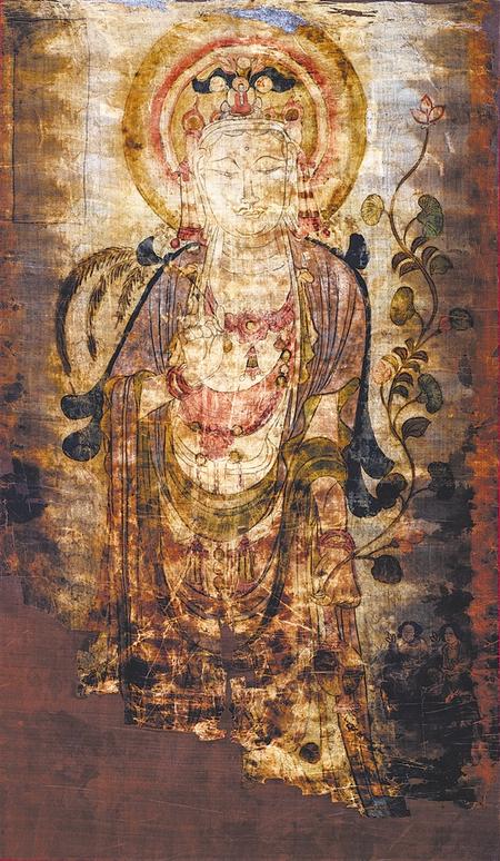 此像雖然褪色嚴重,殘缺不全,卻是敦煌絹畫中極為精美的佳作。觀音菩薩面朝前方,腰肢微扭,左肩前傾。面部輪廓清晰雅致,大耳垂肩,雙目微斂,神態(tài)慈悲安詳。右手持柳枝,左手提凈瓶,彎曲的長莖從瓶口伸出,蓮莖與觀音的站姿相呼應(yīng),搖曳向上在左肩上方開出一朵含苞紅蓮。畫面右下方跪有持蓮花女供養(yǎng)人像二身,她們衣著發(fā)型簡樸。其邊緣和畫面下部缺損嚴重,上部和兩側(cè)保存較完整,左上角長方形榜題呈空白。整幅畫面造型柔美繁復(fù)、勾勒緊勁嚴謹,衣帶翻轉(zhuǎn)飄舞,線條行云流水,疏密有致,加之斑斕的色彩,令畫面熠熠生輝。