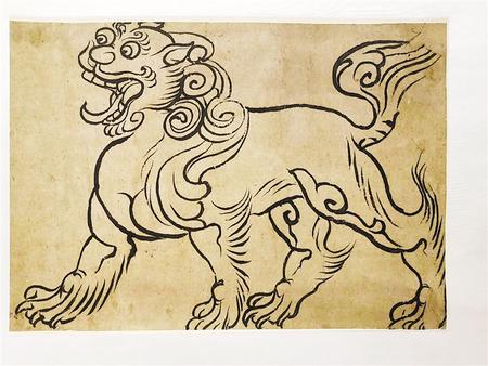 中國本無獅子,原產(chǎn)地是非洲和南美洲,約在漢武帝時才經(jīng)西域傳入。獅子作為進獻的禮物,是敦煌壁畫中最早出現(xiàn)的動物形象之一。由于它的勇猛威儀備受佛教推崇,故在造像和壁畫中曾出現(xiàn)大量的獅子元素。除此,獅子形象還被吸納成為陵墓裝飾和傳統(tǒng)建筑的基本元素。這幅紙本畫,造型準(zhǔn)確、健壯飽滿,昂首闊步、氣宇軒昂,線條遒勁、中鋒用筆,彈性十足,顯示出畫家嫻熟的造型功底,長短弧線勾勒卷毛,寥寥數(shù)筆,卻靈動活潑、灑脫不羈,為不可多得之線描精品。