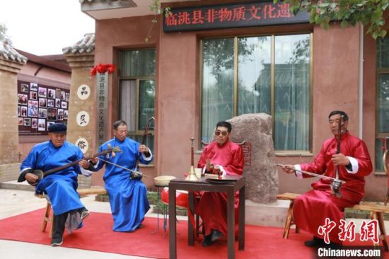 10月12日,甘肅省定西市臨洮縣舉行非物質(zhì)文化遺產(chǎn)展示中心啟動(dòng)儀式。圖為當(dāng)?shù)仄び皯騻鞒腥粟w學(xué)兵(右二)帶領(lǐng)班社表演影子腔。 張婧 攝
