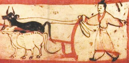 此后,在酒泉丁家閘十六國墓壁畫中就只有一牛牽引的雙轅犁了。說明魏晉時(shí)期是中國從二牛單轅犁過渡到一牛挽拉雙轅犁的時(shí)代,這一過渡的狀況及特點(diǎn)出現(xiàn)在嘉峪關(guān)地主墓葬壁畫中,又說明甘肅是這一重大農(nóng)技改革的地區(qū)之一。