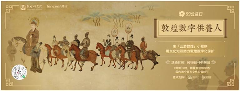 除了創(chuàng)意互動(dòng)帶來(lái)的新奇體驗(yàn),敦煌研究院與騰訊在“99公益日”還將發(fā)布文博行業(yè)首個(gè)公益NFT(Non-Fungible Token,非同質(zhì)化通證)藏品。9月9日9時(shí)開始,用戶在“云游敦煌”小程序參與文化答題即有機(jī)會(huì)獲得這款限量數(shù)字藏品。這份NFT藏品生動(dòng)呈現(xiàn)了《張議潮統(tǒng)軍出行圖》與《宋國(guó)河內(nèi)郡夫人宋氏出行圖》壁畫的細(xì)節(jié),并首次讓用戶在線上觀看到敦煌莫高窟第156窟的全景。