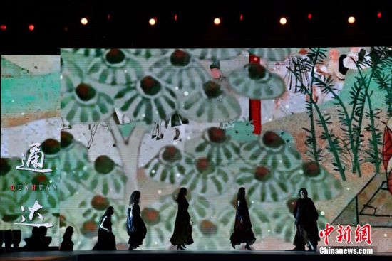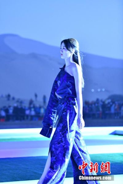 10月16日晚,敦煌國(guó)際時(shí)尚周在鳴沙山月牙泉景區(qū)開(kāi)幕,張肇達(dá)·張凱惠攜手的作品在這里進(jìn)行了展演秀。圖為敦煌服裝秀展示。 殷春永 攝