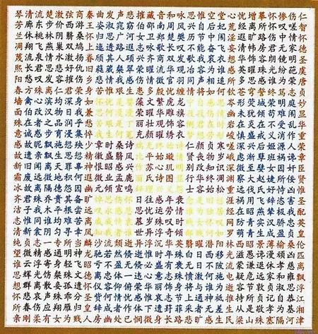 蘇蕙《璇璣圖》不僅是一束厚重的文學(xué)奇葩,也是一幅充滿創(chuàng)意的藝術(shù)巨制。她將詩(shī)歌的載體從傳統(tǒng)簡(jiǎn)帛紙張轉(zhuǎn)換成為錦。錦是有彩色花紋的高級(jí)絲織品。以錦為書寫材料制作《璇璣圖》,除詩(shī)歌本身的創(chuàng)作外,首先需要染絲紡織。錦織好后,又要對(duì)《璇璣圖》謀篇布局,劃區(qū)設(shè)色,書詩(shī)于錦,然后一針一針地將它繡出來(lái),變?yōu)榛匚腻\字。那每一道工序,要求都極精細(xì),不得有半點(diǎn)疏忽,不然就會(huì)留下污點(diǎn)和遺憾。蘇蕙集眾藝于一身,完美地將其制作出來(lái),體現(xiàn)了她的綜合藝術(shù)才能。取名“璇璣(泛指北斗)圖”,寓意它像北斗,可以旋轉(zhuǎn)地讀。它是在華美的錦上,又以五彩繽紛的絲線繡上《璇璣圖》,不僅顏色更加艷麗,而且那841個(gè)金玉珠璣般文字,展現(xiàn)的令人眼花繚亂的詩(shī)歌園地,更是前不見(jiàn)古人,后不見(jiàn)來(lái)者,比錦繡的光彩更加耀眼奪目。