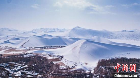 雪落敦煌月牙泉小鎮(zhèn)。 王斌銀 攝