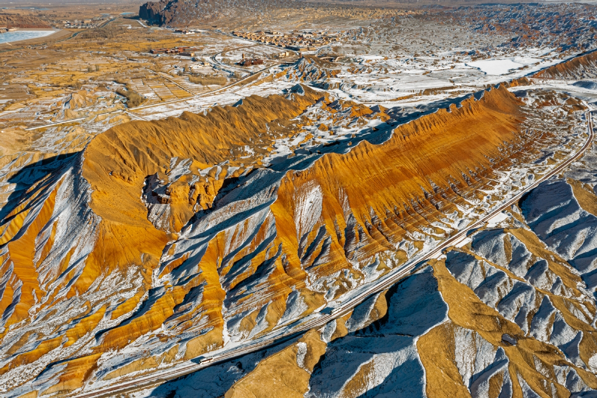 2021年12月12日,甘肅省張掖七彩丹霞在白雪的映襯下,層理交錯、色彩斑斕,顯得格外艷麗多彩、美輪美奐。