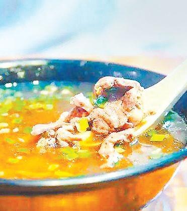 東門巷、喇家巷的牛雜割也上演著與肉酒一樣的故事,冬日里的牛雜割鋪?zhàn)涌偸切v騰的,在雜割湯翻滾的撲鼻中,一碗又一碗的雜割端上桌了。蒜苗與芫荽沫作為菜頭,讓一碗牛雜割青綠且香味撲鼻,拿了筷子,手心里一抹,而后咽一下口水,吸溜一口湯,目光跟著筷子在碗里攪動(dòng),留意牛舌多了一塊還是蹄筋少了,先巡察一番,然后咬一口白餅,喝口湯,幾口之后才吃雜割。