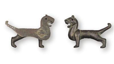 銅虎符(圖③)高4.7厘米、長6.9厘米。虎圓豎耳,怒目張口,挺胸昂首,尾上翹,作奔走狀。符頭部有圓穿孔,背面有凸起的十字扣。符身正面陰刻篆書“永安府”字樣,背面陰刻楷書“右翊衛(wèi)”“右驍衛(wèi)”“永安四”“蘭豐二”等字樣。右翊衛(wèi)、右驍衛(wèi),官署名,為隋唐十六衛(wèi)中的兩衛(wèi)。隋初稱左右衛(wèi),隋煬帝時改為左右翊衛(wèi),所領軍士稱驍騎。館藏虎符出土于甘肅莊浪,是隋代府兵駐防莊浪的歷史見證,是研究隋代府兵制度的重要實物資料。