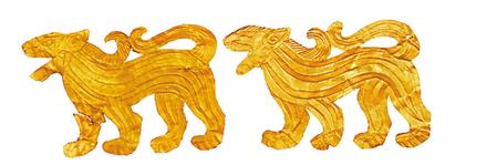 受草原文化影響,虎的造型更具藝術(shù)性,形式亦豐富多彩。甘肅省博物館藏的西周虎紋耳形銅鉞,整體似半環(huán),鑄猛虎紋,虎背為刃。尾下有短胡兩穿,尾、雙爪上鑄凹槽,虎首下彎,張口含銎,露牙睜目,領(lǐng)內(nèi)有一圓形穿孔。甘肅省文物考古研究所藏的戰(zhàn)國金帶鉤,鉤首為長頸龍首狀,頸部為三棱狀,肩部三角形邊框內(nèi)鏤空雕鑄對稱和狼形圖案。鉤身為長方形,邊框內(nèi)鏤空雕刻一組正反相對稱的虎噬大角羊圖案。張家川回族自治縣博物館藏的戰(zhàn)國晚期的虎形金飾片,虎尖耳上翹,大嘴張開,鬃毛卷曲上翹,尾前卷于背部與鬃毛相連,四足著地做行走狀,栩栩如生地展現(xiàn)了虎行走的動感之態(tài)。甘肅省博物館藏的戰(zhàn)國虎噬羊紋金飾片,虎張口露齒,垂首蹲踞,虎口銜羊,前爪按住羊肩部,后爪抓住羊臀部,羊四肢跪地作掙扎狀,活靈活現(xiàn)地展現(xiàn)出猛虎捕食羊的瞬間動態(tài),形象逼真。這些虎文物都是此次展覽中的亮點。