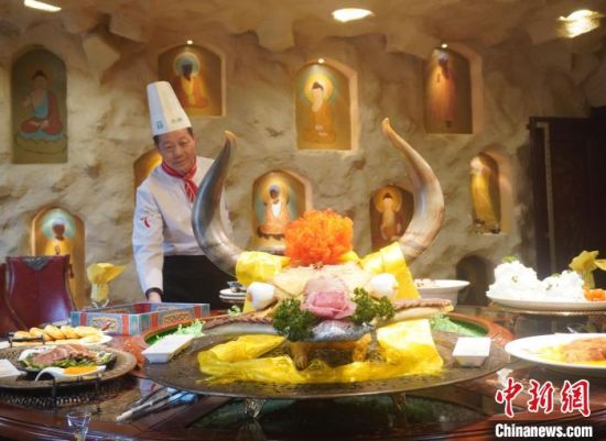 中新網(wǎng)蘭州3月29日電(張婧)“來(lái)自壁畫中的敦煌菜,背后都藏著真實(shí)存在的人或事、景或點(diǎn)。”國(guó)家特一級(jí)烹調(diào)師趙長(zhǎng)安長(zhǎng)期從事于敦煌菜的歸納與發(fā)展。他說(shuō),無(wú)論菜名還是菜式的賣相,都融入敦煌故事或圣境圣水,可謂“一菜一典故,一席十圣境”,讓人仿佛置身于古絲綢之路上。