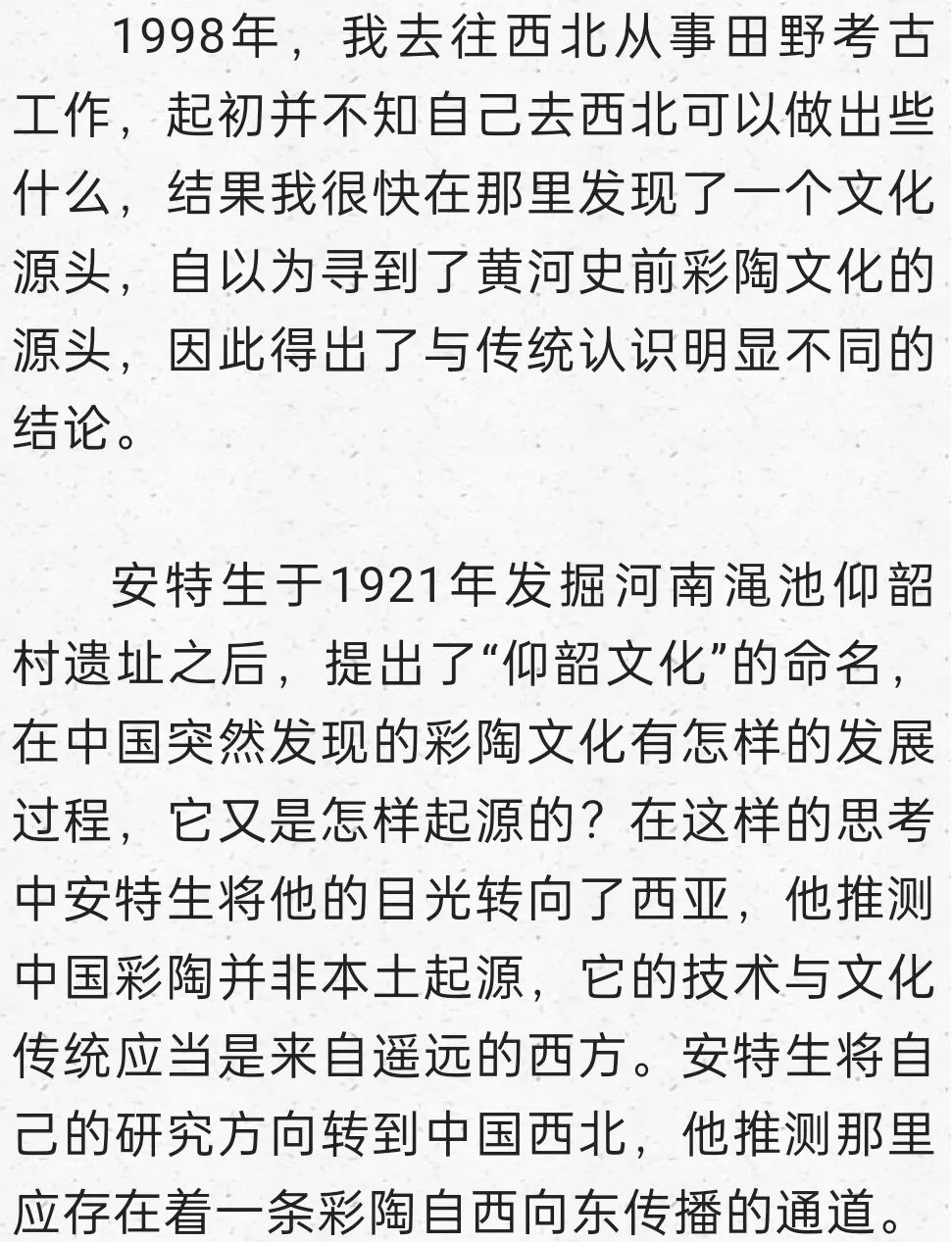 安特生從1923年開始沿黃河西行,去追溯仰韶文化和彩陶文化的源頭。他在甘肅和青海一帶發(fā)現(xiàn)了豐富的古文化遺存,發(fā)現(xiàn)了比中原數(shù)量更多的彩陶,這使得他流連忘返,一直在那里待了近兩個(gè)年頭。安特生發(fā)現(xiàn)六種考古學(xué)文化中都見到了彩陶,他認(rèn)為這些考古學(xué)文化處于新石器時(shí)代晚期到向青銅時(shí)代過渡的時(shí)期,絕對(duì)年代約在公元前3500年到1500年之間,包括仰韶在內(nèi)它們代表了6個(gè)發(fā)展階段,它們是齊家期、仰韶期、馬廠期、辛店期、寺洼期和沙井期,這便是他創(chuàng)建的“六期說”。將齊家期放在仰韶期之前,齊家期簡單而質(zhì)樸的彩陶紋飾,被認(rèn)定是彩陶開始出現(xiàn)的證據(jù)。