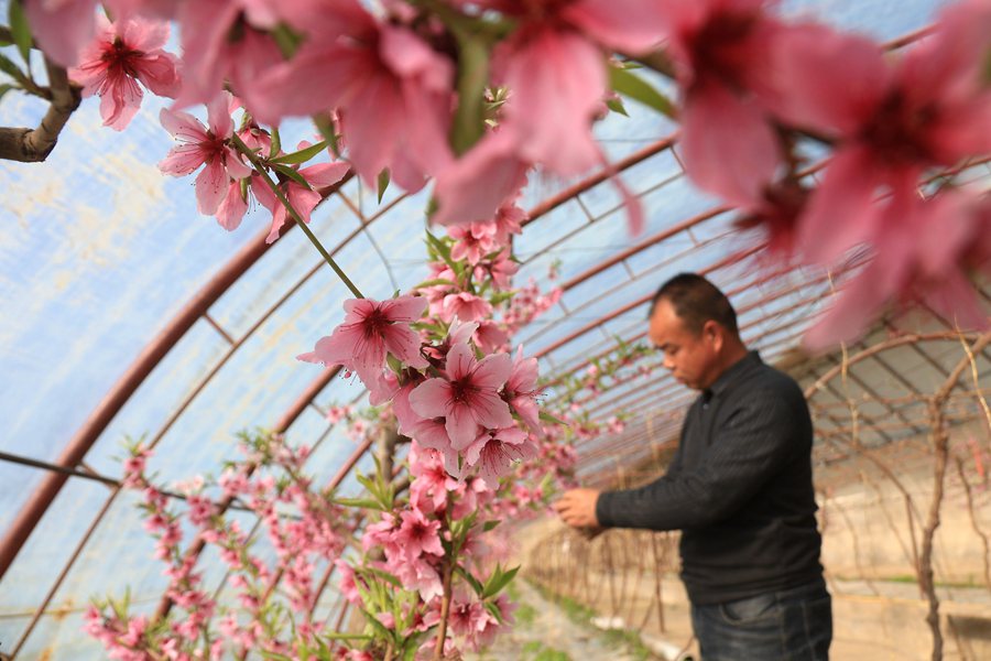 農(nóng)民在溫室中為桃樹(shù)疏花。張曉亮攝