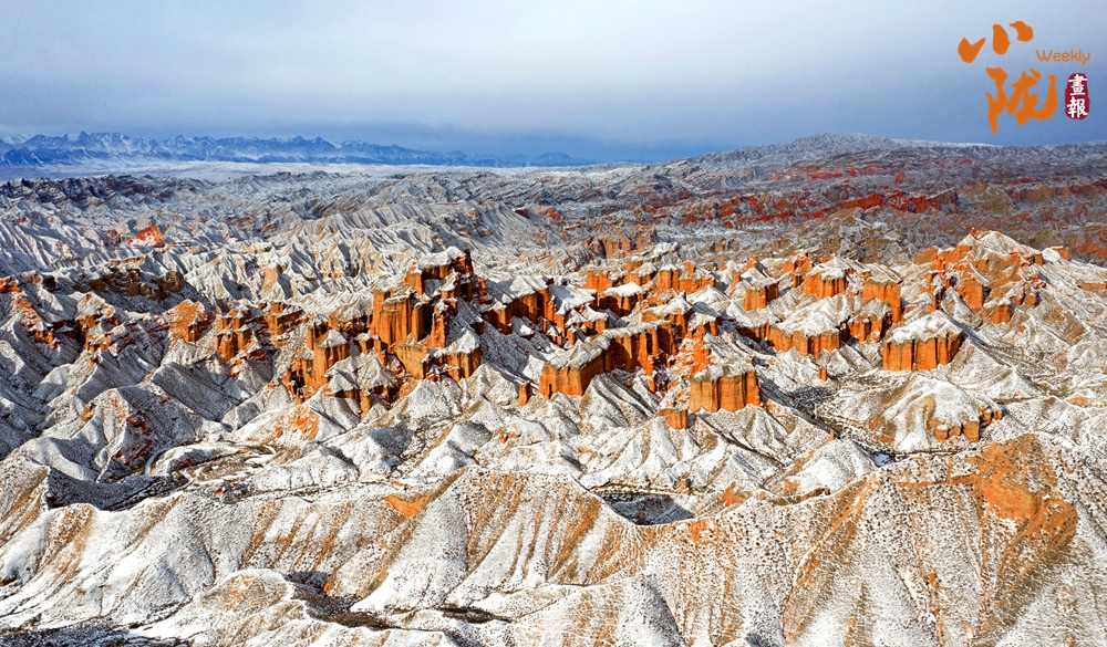 雪后,赤紅色的丘陵充滿陽剛之美,白雪宛如輕紗浸在丹霞山上,顯得格外艷麗多彩、如夢如幻。