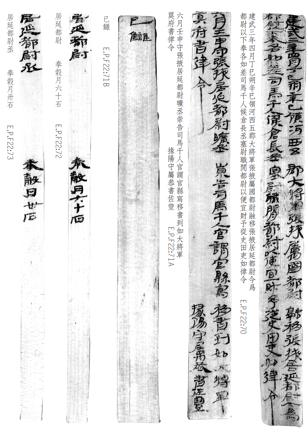 1974年8月出土于甲渠候官遺址第22號房址內。簡冊由10枚簡組成,每簡長22.8厘米,前兩簡寬2.5厘米,其余8簡寬1.4厘米。全文200字。內容為東漢建武三年(公元25年)竇融統(tǒng)治河西期間留下的一份完整的財政文書。簡文是關于居延都尉府吏員奉谷標準的通知,由領河西五郡大將軍張掖屬國都尉竇融幕府下發(fā),簡言“如律令”可知其指令具有法律效力。