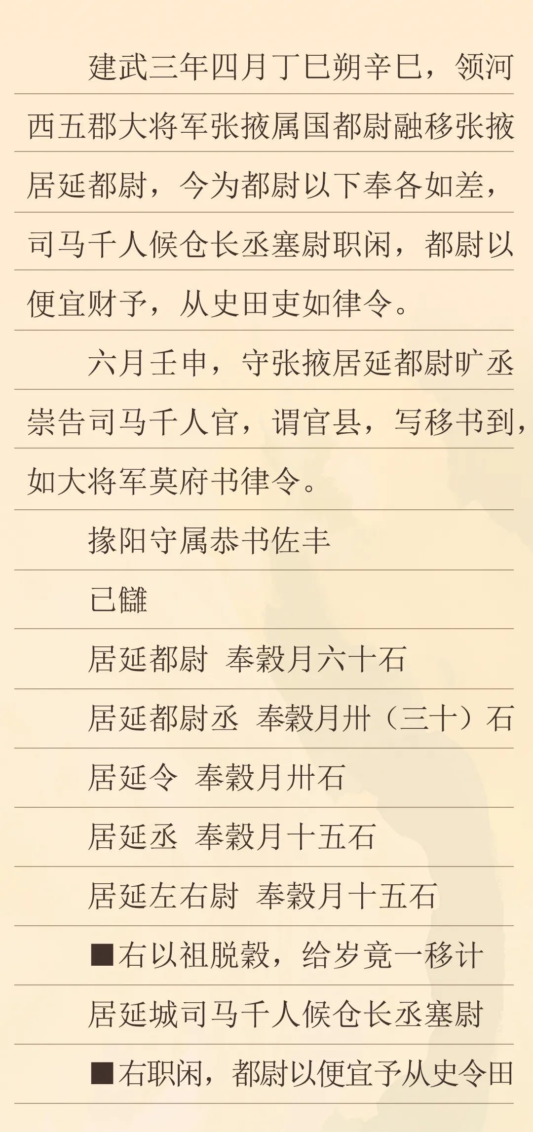 這封冊書記載了建武三年,竇融管轄河西時發(fā)布的一條關于都尉以下官吏奉谷等差的命令。根據(jù)竇融發(fā)布的新規(guī)定,我們可以看到,秩比二千石的居延都尉月奉谷僅為六十石,史書有“十斗一斛”及“十斗一石”的記載,此六十石即是六十斛,相比于史書記載中比二千石每月百斛的俸例要少,而其余官吏的俸祿也相應要少,雖然漢代不同時期的官吏俸祿存在變化,但對比所見的這種情況,可能也跟兩漢之交戰(zhàn)亂頻仍的社會環(huán)境有重要關系。