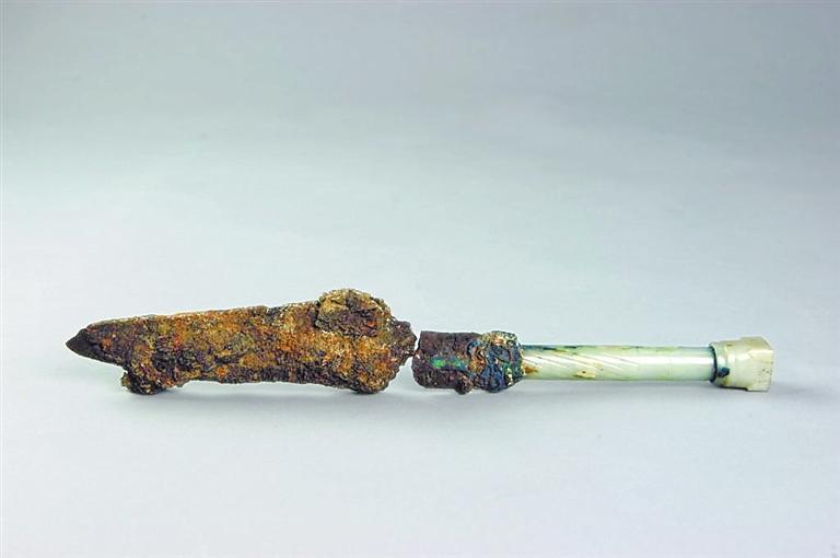 玉柄鐵劍出土于河南三門(mén)峽虢國(guó)國(guó)君虢季的墓葬,全長(zhǎng)34.2厘米,其中劍柄長(zhǎng)12.2厘米,劍身長(zhǎng)22厘米。劍柄為銅芯,起到連接劍柄和劍身的作用,銅芯外鑲有晶瑩透亮的和田美玉和綠松石,并有精美的竹節(jié)飾紋,劍身和劍柄的結(jié)合處也鑲有綠松石。劍身經(jīng)由北京科技大學(xué)冶金與材料史研究所鑒定,是由塊煉法鍛制而成,劍身外有絲織品包裹的痕跡,應(yīng)當(dāng)是被絲織品包裹后放入劍鞘。劍鞘則由牛皮精制而成。這把玉柄鐵劍不僅制作精美,而且其利用玉、銅、鐵三種材料制作而成,是我國(guó)目前考古發(fā)掘出土的年代最早的人工冶鐵制品。它將我國(guó)的人工冶鐵歷史推前了近兩個(gè)世紀(jì),被專(zhuān)家們譽(yù)為“中華第一劍”。
