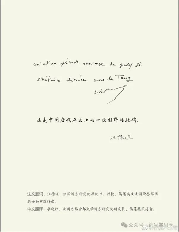 汪德邁先生對(duì)于馮玉雷這部作品給予高度評(píng)價(jià),2018年專(zhuān)門(mén)題辭:“這是中國(guó)唐代歷史上的一次狂野的馳騁。”馮教授專(zhuān)門(mén)把汪德邁先生給他的法文與中文題辭作為題簽印在書(shū)封面上,他多次跟我說(shuō):“幸遇汪德邁教授、李曉紅教授,受益良多,感激之情,難以言表。”