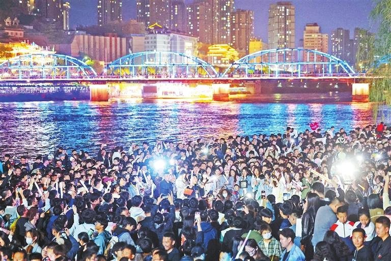 作為蘭州的地標(biāo)之一,中山橋已經(jīng)是來(lái)蘭游客必“打卡”的景點(diǎn)。火熱“出圈”的“黃河大合唱”成為蘭州旅游新體驗(yàn)。華燈初上,游客和市民齊聚黃河岸邊,隨著音樂齊聲合唱,場(chǎng)面壯觀,氣氛熱烈。“五一”假期首日,蘭州文旅市場(chǎng)迎來(lái)火爆“開門紅”,接待游客達(dá)到了86.42萬(wàn)人次。