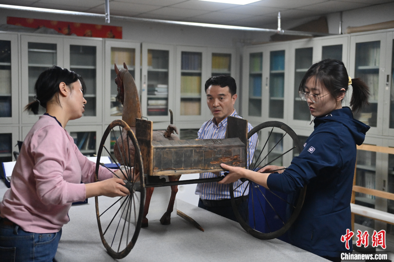 甘肅省博物館工作人員組裝復(fù)原漢代彩繪木軺車。李亞龍 攝