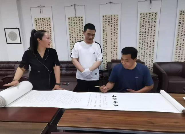 甘肅省硬筆書法家協(xié)會主席焦?jié)M金(右一)為長卷題詞