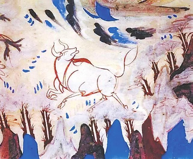 在莫高窟第454窟壁畫中有一幅“耕牛圖”:畫面刻畫了一頭正在勞作的耕牛。畫師用土黃色作為畫面的主色調,將正在馭牛的人只是寥寥數(shù)筆勾勒其形體而已,卻用了醒目的赭紅色來表現(xiàn)一頭牛正在使盡全身力氣耕耘的形象。透過畫面我們能感知到這是一頭“不待揚鞭自奮蹄”的老黃牛。除了描繪在農耕生活中勤勤懇懇的耕牛,敦煌壁畫中還描繪了其他形形色色的牛。在莫高窟第249窟壁畫中有一幅“受驚的野牛圖”,畫面上刻畫了一群在山林間閑庭信步的野牛,它們神色安詳自若。忽然一只矯健的猛獸疾馳而至,其中一頭牛受驚回首。這些均被技藝精湛的畫師惟妙惟肖生動勾勒而出。我們看到一只肌肉健碩、神態(tài)生動的野牛幾乎要從壁畫中呼之欲出,令人唯恐避之不及。還有在莫高窟第61窟壁畫中有一幅“金牛宮圖”,這是“黃道十二宮”中的其中一幅圖。所謂的“黃道十二宮”就是今天所說的十二星座,畫面中的金牛體態(tài)豐滿,神態(tài)安詳,牛的敦厚忠誠、樸實溫馴、勤勉勞作、默默無聞的精神贏得了人們的信任。