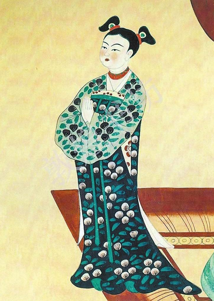 我們都知道服裝最經(jīng)典的配色是黑白灰,尤其是黑白配,其實這種配色也是敦煌壁畫中的經(jīng)典。在莫高窟第100窟壁畫中有一幅“舞者圖”:畫面上男舞者被定格在一個扭腰送胯雙臂屈伸的舞蹈動作中,他上身穿著中長款的黑色圓領長袖缺胯衫,用白色帛帶束腰。下身則搭配一條白底團花大口褲。在莫高窟第12窟壁畫中有一幅“供養(yǎng)人圖”:畫面上一對母女身著襦裙,上襦下裙的著裝風格相當于今天服飾的無袖連衣裙加一件長袖開衫。在畫面上女兒的上衣和媽媽的裙子是同樣的藍色,女孩的裙子和媽媽上衣是同為赭色,只不過各自的花紋樣式不同,但是母女倆胸前的結帶卻是同色同花、一模一樣。畫師如此別出心裁的呼應,顯得既溫情又醒目。