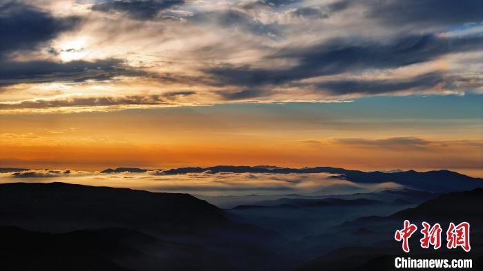 8月14日晚,蘭州市榆中縣馬坡鄉(xiāng),夕陽(yáng)在云海里翻滾,映照大地和村莊城鎮(zhèn),美不勝收。圖為云海日落籠罩黛青色山脈。丁永睿 攝