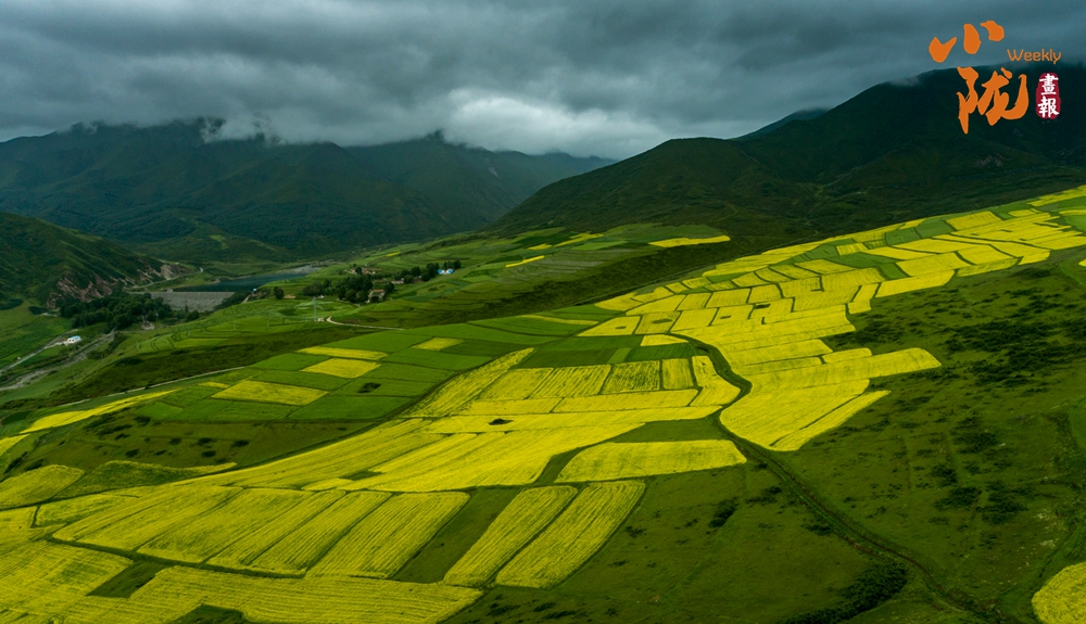 黃燦燦的油菜花鋪蓋在逶迤的山坡上,染盡山野,與此起彼伏的祁連山脈、古樸的民舍、一望無(wú)際的田野,共同繪就了一幅極具藝術(shù)感的“油畫(huà)”。