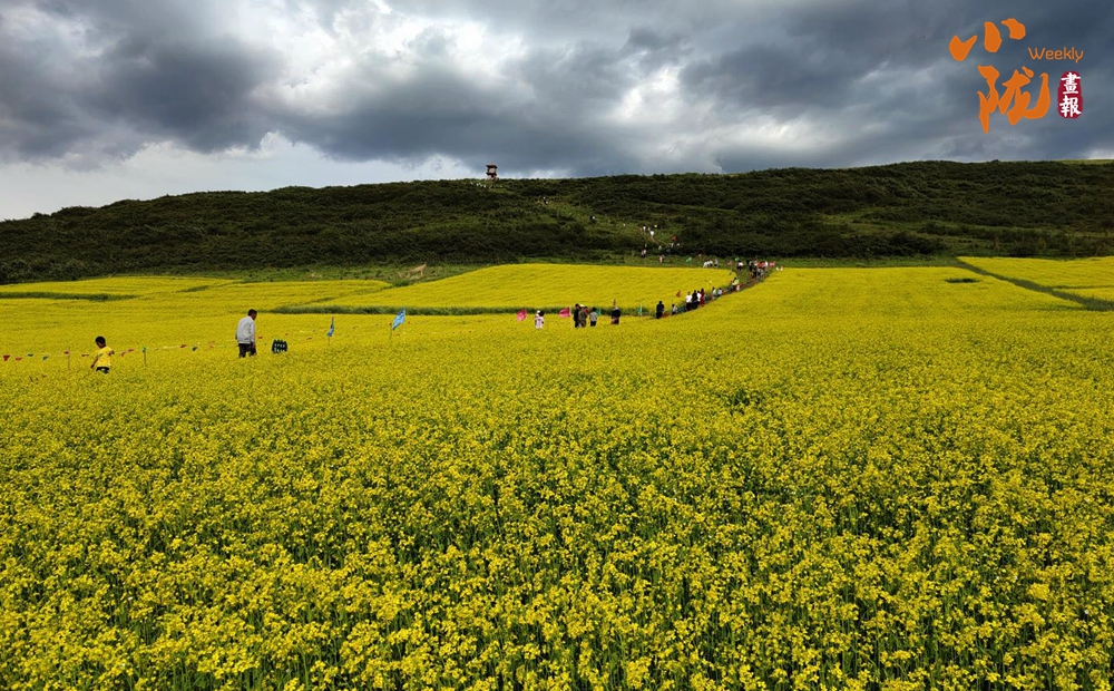 一場(chǎng)細(xì)雨過(guò)后,微風(fēng)吹拂,金黃色的花朵隨風(fēng)搖曳。游客們置身花海,賞花、拍照,盡情享受大自然饋贈(zèng)的田園詩(shī)意。
