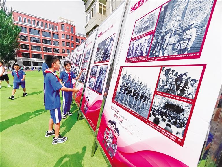 活動現(xiàn)場,該館講解員給孩子們講述了《抗戰(zhàn)烽火中的少年兒童》及《英雄血灑黃河畔——叢德滋》紅色故事。之后,蘭州市口琴藝術交流學會的成員現(xiàn)場演奏了《沒有共產黨就沒有新中國》《游擊隊之歌》《中國少年先鋒隊隊歌》等經典紅色曲目。圖為學生觀看展板。
