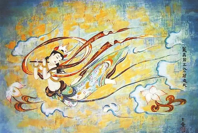 敦煌莫高窟,窟窟有壁畫,拼接起來長達45000多平方米,有世界上“最大畫廊”之稱。這些壁畫中,幾乎每幅都有舞蹈形象,如在窟頂、龕楣、藻井遨游的飛天,憑欄上的天宮伎樂,經(jīng)變畫中的娛佛、敬佛的獻舞者——伎樂天,出行圖中跳著具有濃郁生活氣息的世俗樂舞,以及富有舞蹈美感的彩塑菩薩、天王力士等,琳瑯滿目,精妙絕倫。這些舞蹈形象充分反映了從十六國北朝至元代千余年來不同歷史時期的舞蹈服飾、形態(tài)、風貌,為我們挖掘、整理、弘揚中華民族舞蹈文化提供了十分珍貴的形象資料。