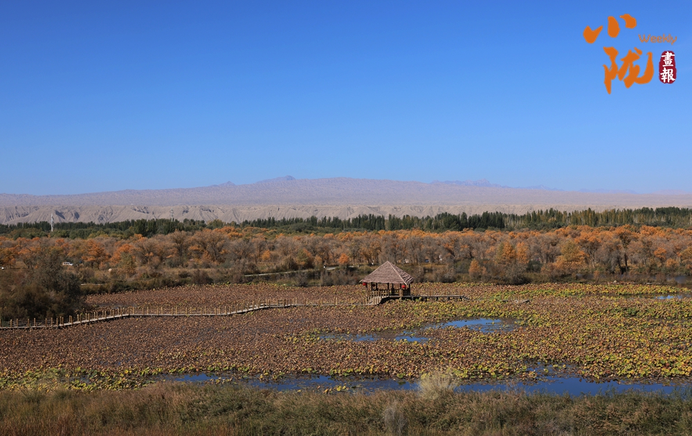 一大片荷花池,因為是深秋,池內(nèi)的荷葉已經(jīng)枯萎,變成金黃色,與周邊的金胡楊相映成趣。蒼勁的胡楊,高雅的荷花在此結緣。葦草繁茂,野花盛開,置身其中,仿佛走進金色的海洋。
