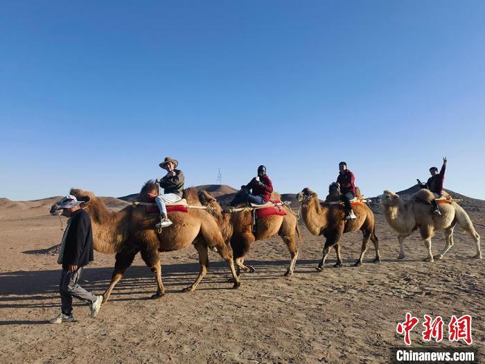 圖為留學生在陽關景區(qū)體驗乘騎駱駝。劉玉桃 攝
