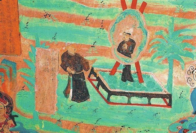 戰(zhàn)國時期楚國詩人屈原在《漁父》一文中寫道:“吾聞之,新沐者必彈冠,新浴者必振衣。安能以身之察察,受物之汶汶者乎?”意思是說我聽說剛洗過頭的人一定會去彈彈帽子上的灰塵;剛洗過澡的人一定要抖抖衣服的灰塵。怎能讓清白的身體去接觸世俗塵埃的污染呢?當(dāng)年的敦煌人走出溫泉,在身心放松之后,就該靜觀返照自己了。在莫高窟第85窟中有一幅“曲花式鏡圖”:畫面上在一個正方形鏤空的底座上擺放著一個巨大的曲花式鏡,鏡子式樣別致,明亮澄澈。藍(lán)色的曲花式樣引人矚目。但畫面上最吸睛的是一位魁梧俊朗身著一襲赭色長袍的男子,他正在鏡子前仔細(xì)地打量自己,而鏡中映射出他神情凝重的情態(tài)來。原來,古人照鏡除了正衣冠之外,還有反觀自照的含義,在鏡子前良久地注視自己,就是對自己反省、頓悟的過程。“一年好景君須記”,走過四季,到了歲末,該是每個人回望來時路,展望前方的時候了。