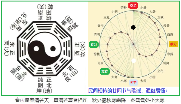 八卦是中華先民理性思維和高度智慧的結(jié)晶。華夏7000年前伏羲創(chuàng)制的八卦圖最初是用來(lái)分時(shí)紀(jì)年的,而在此基礎(chǔ)上發(fā)展起來(lái)的廿四節(jié)氣后來(lái)卻大放異彩。所謂“太極生兩儀,兩儀生四象,四象生八卦”的陰陽(yáng)變化,其實(shí)指的就是四季輪替,它代表了事務(wù)孕育、發(fā)展、成熟和衰亡的自然規(guī)律,告訴世人“變化,才是永恒不變的規(guī)律”這一本質(zhì)!如果在八卦圖上繼續(xù)往下切分,就能很自然地從八卦圖上得到廿四節(jié)氣(見圖)。