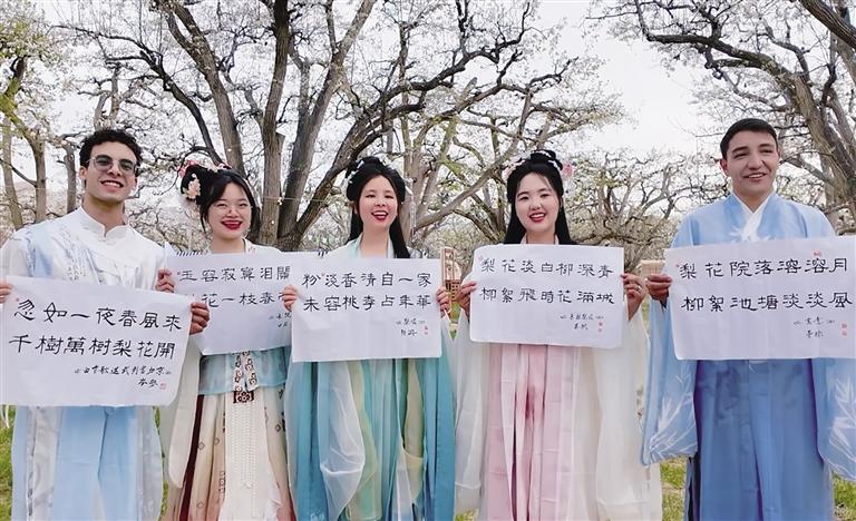 在接下來的詩詞互動(dòng)環(huán)節(jié),外籍留學(xué)生開啟換裝模式,身著漢服,徜徉在梨花樹下,吟誦著“梨花”主題的詩句,感受中國(guó)漢服之美和中國(guó)傳統(tǒng)文化的魅力。換裝后的外籍留學(xué)生也讓梨園秒變“出片現(xiàn)場(chǎng)”。“這是我第一次穿漢服,穿著漢服在梨園里拍的照片真的很好看。”來自越南的黃青草,迫不及待地想把這份梨園的浪漫春日記憶分享給自己的同學(xué)、朋友。