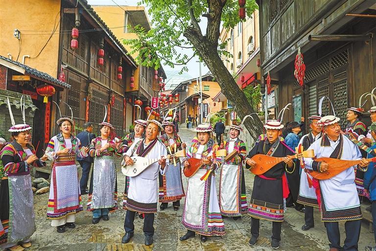 在文縣鐵樓藏族鄉(xiāng)草河壩村白馬山寨,土琵琶彈唱表演吸引游客駐足觀賞。新甘肅·甘肅日?qǐng)?bào)記者 馮樂(lè)凱