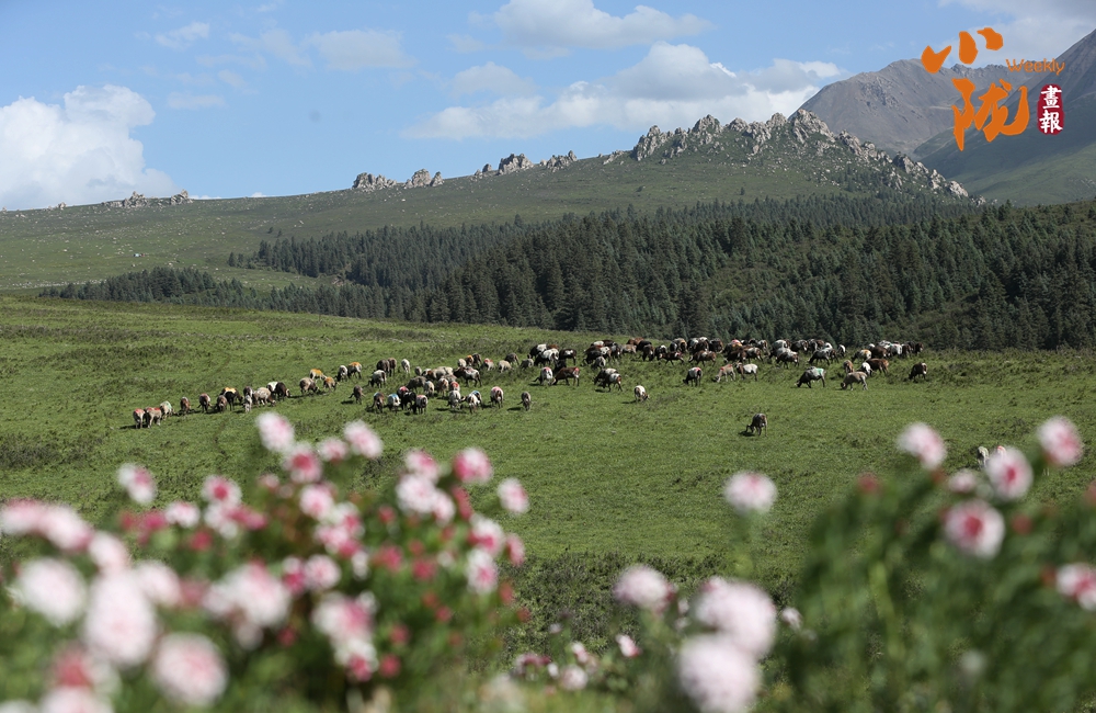 初夏時(shí)節(jié),祁連山國家公園張掖肅南縣境內(nèi),天空湛藍(lán)如洗,草原碧綠廣闊,巍峨的雪山仿佛插入云端,牛羊在青草中覓食,勾勒出一幅天然秀麗的生態(tài)畫卷。