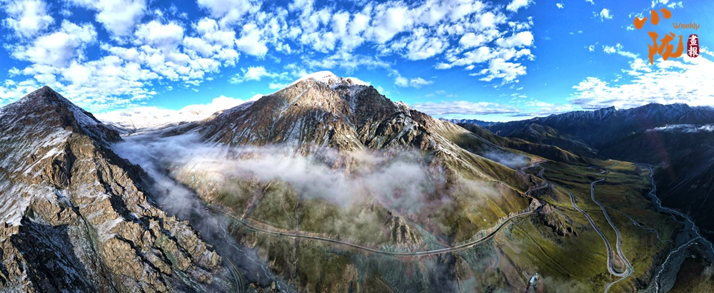側(cè)目而視,近日一場降雪和夏日閑云相伴相依,近處的雪和遠(yuǎn)處的云相映成趣,共同把天空擦拭得深藍(lán)如鏡。這種“積雪長留峰素裹,浮云飄忽去無邊”的夢幻景色,會(huì)將你平日里積蓄在心頭的那些世俗凡塵濯洗得干干凈凈,有一種遠(yuǎn)離人世的幻覺。