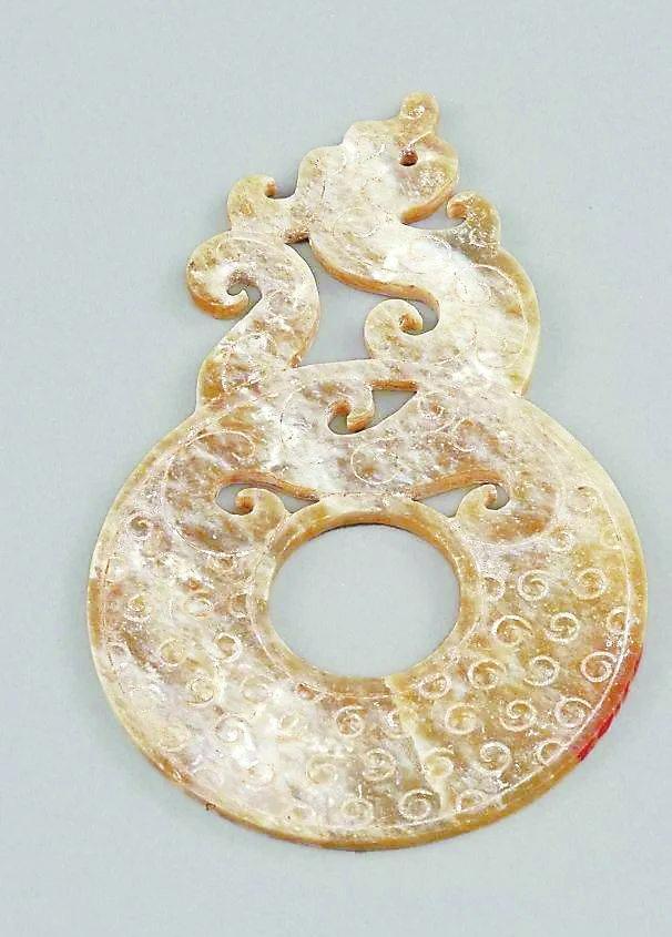 玉璧通高11厘米、直徑6.9厘米、孔徑2.4厘米、厚0.4厘米,征集品。玉料為青玉,整體顏色為青灰色,有灰白沁。琢磨成形,體呈平片狀。下部呈圓形,中有圓孔,孔徑小于肉寬,三分之二雕稀疏谷紋。龍首與龍尾出于璧廓之外,腹部鏤雕在璧孔之上的肉部,有三個一端彎鉤的三角狀鏤孔,其中下部兩個鏤孔左右對稱。龍昂首,軀體屈曲,尾部卷而上貼首后,有騰空而起之勢。龍首尾之間有一個不規(guī)則的大鏤孔,龍嘴上有一圓形小系孔。