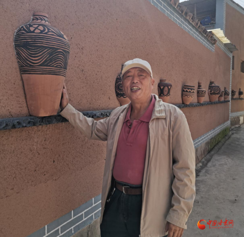 探訪完寺洼遺址后,記者一行又來到馬家窯村實地采訪。走進馬家窯村,街道干凈整潔,花壇綠蔭中紅花奪目。尤其花壇內(nèi)間隔樹立的馬家窯陶器,和村內(nèi)道路兩旁墻上鑲嵌的造型各異的陶器,更讓整個村子彌漫出濃厚的歷史氛圍。