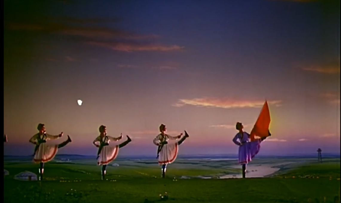 《草原女民兵》最初作為舞臺舞蹈,其美學(xué)特質(zhì)建立在現(xiàn)場性、即時(shí)性與三維空間性之上。而當(dāng)它通過《百花爭艷》的鏡頭被重新詮釋時(shí),經(jīng)歷了一場深刻的美學(xué)轉(zhuǎn)換。電影不僅記錄了這一舞蹈,更通過其特有的語言系統(tǒng),對舞蹈進(jìn)行了二次創(chuàng)作與美學(xué)升華。