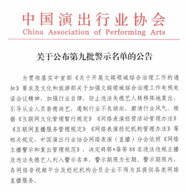 中國演出行業(yè)協(xié)會網(wǎng)絡(luò)表演(直播)分會近日發(fā)布了第九批網(wǎng)絡(luò)主播警示名單,包括“鐵山靠”“郭老師”兩名職業(yè)主播和“吳亦凡”“鄭爽”“張哲瀚”三名演員在內(nèi)的88名主播將在行業(yè)內(nèi)被實行聯(lián)合抵制和懲戒。這是違法失德藝人首次被納入網(wǎng)絡(luò)主播警示名單中,防止劣跡藝人轉(zhuǎn)移陣地復(fù)出。