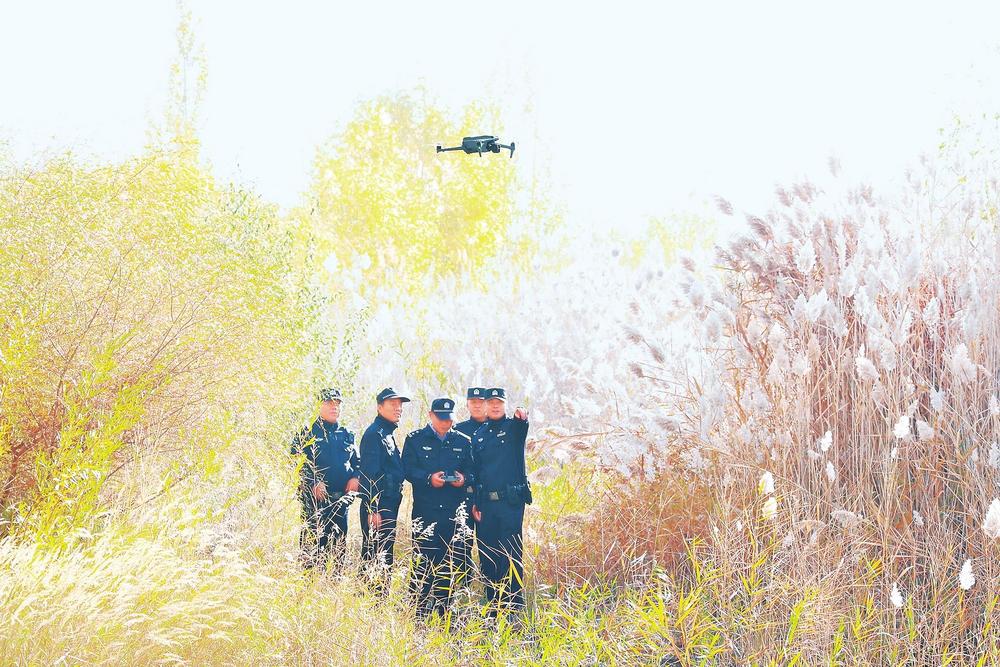 民警在濕地公園利用無人機(jī)開展巡查。
