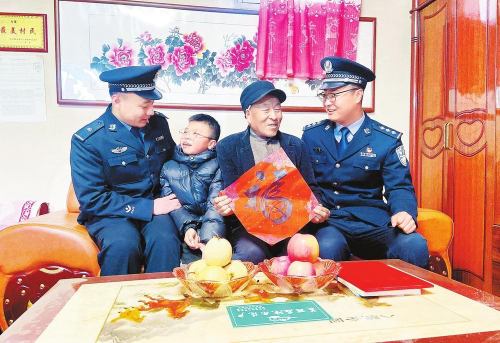 “史大爺,過(guò)年好呀!我們送福來(lái)了。”民警小李一邊說(shuō)著,一邊將一張福字遞到史大爺手中。史大爺接過(guò)福字,笑得合不攏嘴,激動(dòng)地說(shuō):“謝謝你們啊,警察同志,這福字往門上一貼,年味兒一下子就濃了!平日里多虧了派出所民警的照顧,這大過(guò)年的還想著我們,你們辛苦了。”
