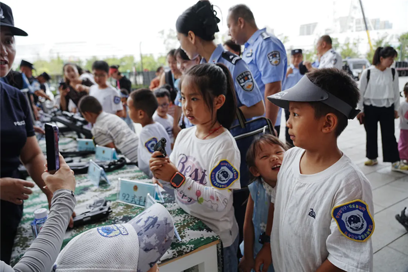 帶著興奮和期待,小朋友們的警營探索之旅開始了!在奧體中心警務(wù)站和警航作戰(zhàn)單元,他們沉浸式參觀了現(xiàn)代警務(wù)工作和警用無人機(jī)的指揮調(diào)度,直觀了解了公安工作的日常場景。另一邊,小朋友們在民警的指導(dǎo)下,一個個親手拿著警用武器裝備零距離“拍照打卡”,“這個好酷!”“看我的!”小朋友們的驚嘆聲此起彼伏。