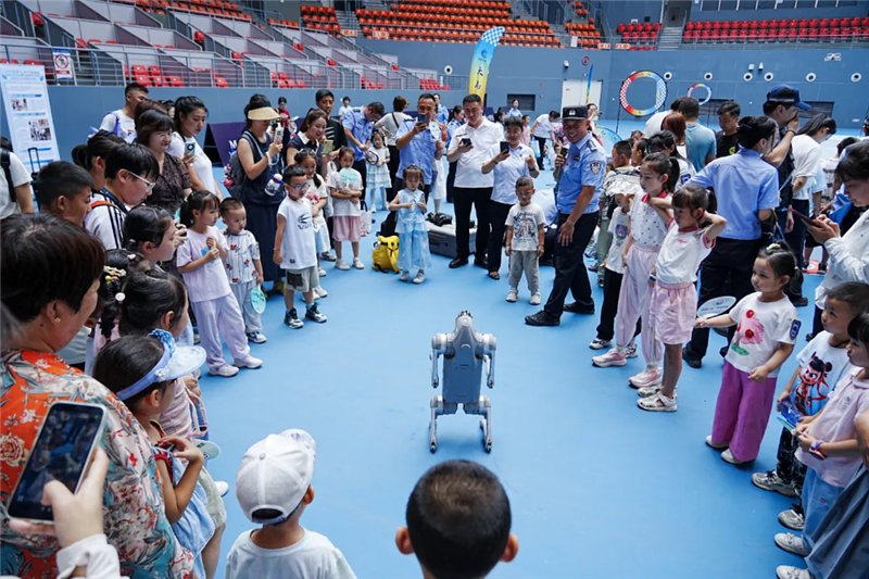 緊接著,在網(wǎng)球館前,大家首先被特警隊員精彩的防暴小隊?wèi)?zhàn)術(shù)演練所震撼,矯健的身手贏得了陣陣掌聲。警犬迅猛精準(zhǔn)的撲咬展示更是讓小朋友們連連叫好。警用機(jī)器狗的靈活表演引得大家紛紛上前互動,最讓小朋友們躍躍欲試的還是無人機(jī)穿梭器的體驗環(huán)節(jié),戴上眼鏡感受著穿梭器的“速度與激情”,孩子們臉上洋溢著喜悅和興奮,近距離感受到了科技在公安工作中的強(qiáng)大應(yīng)用。