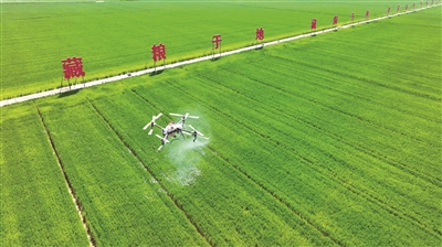 近年來,江蘇省宿遷市宿豫區(qū)多措并舉推動耕地保護責任落實,加快現(xiàn)代農業(yè)產業(yè)園核心區(qū)建設,保障糧食穩(wěn)產增產。圖為近日,在該區(qū)新莊小麥單產提升示范區(qū),無人機正在進行植保噴灑作業(yè)。朱冠軍 攝
