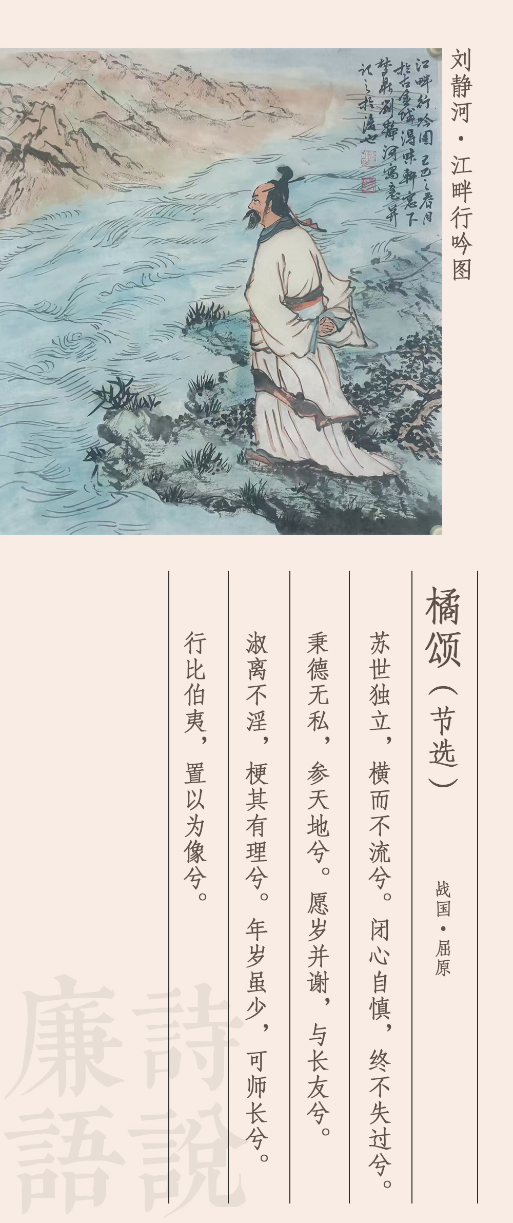 《橘頌》被譽為中國最早的詠物詩。據(jù)考證,屈原在流放之初,苦悶憤激,看到南國的橘樹,心有所觸,將橘樹人格化,賦予其君子仁人的品格,寫下了這首詩。詩分兩部分,前半部分寫實,刻畫了橘樹的生長習性和枝葉花果,后半部分抒情議論,托物言志,橘人合一,情景交融。這里節(jié)選了后半部分,大意如下:清醒立世啊不隨波逐流,小心謹慎啊過失從不留,沒有私欲啊與天地比儔,我與你同生死啊永結(jié)為好友,你形象美好啊耿直作一流,你風華正茂啊堪為好師長,你高潔比伯夷啊榜樣最優(yōu)秀。