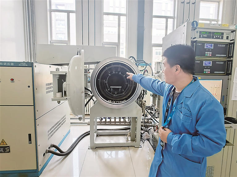 中國科學(xué)院空天信息創(chuàng)新研究院行波管工藝技術(shù)負責(zé)人劉泳良介紹高溫真空釬焊爐的用途。左翰嫡 攝