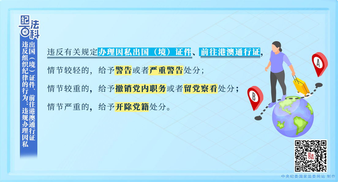 《中國(guó)共產(chǎn)黨紀(jì)律處分條例》第九十一條規(guī)定:“違反有關(guān)規(guī)定辦理因私出國(guó)(境)證件、前往港澳通行證,或者未經(jīng)批準(zhǔn)出入國(guó)(邊)境,情節(jié)較輕的,給予警告或者嚴(yán)重警告處分;情節(jié)較重的,給予撤銷黨內(nèi)職務(wù)或者留黨察看處分;情節(jié)嚴(yán)重的,給予開(kāi)除黨籍處分。”